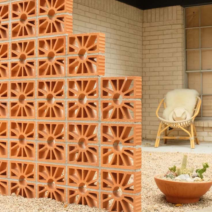 : 独特的放射状镂空花纹设计,是视觉上的核心亮点 —— 从中心向外延展的几何线条,既形成了通透的光影效果,又有效减轻了砖体自重、提升了通风透气性,让建筑立面兼具实用功能与艺术美感。